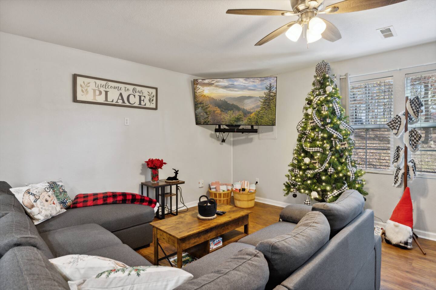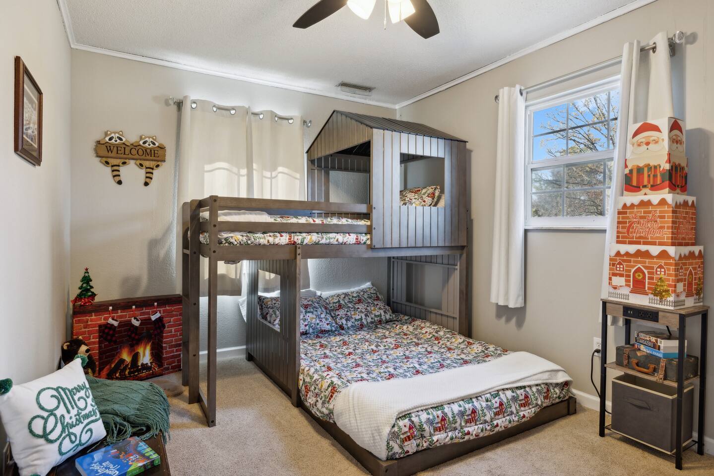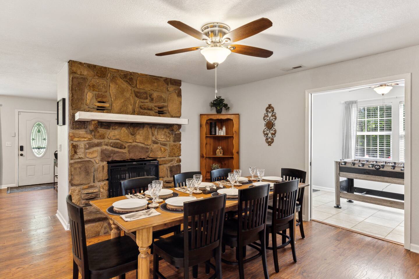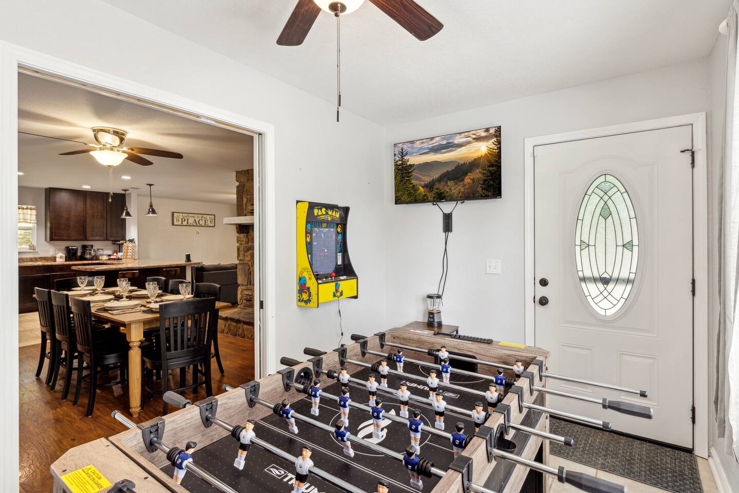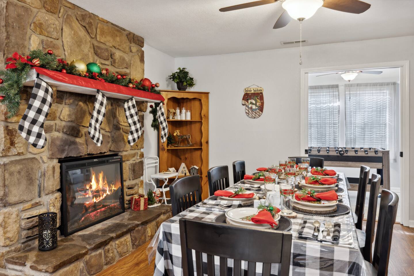Smoky Mountain Cozy Cottage - Family-Friendly Cabin with Game Room, Tiki Bar, Pool, Hot Tub About this space • Bedrooms: King, Queen, Twin-over-Full Bunk, Sleeper Sofa • Amenities: Scenic Views, Tiki Bar, 7 Smart TVs, Gas Fireplace, Game Room • Location: 2.7 miles to Dollywood, 4 miles to Pigeon Forge Parkway, 12 miles to Great Smoky National Park • Internet: Xfinity High-Speed Wi-Fi Welcome to Smoky Mountain Cozy Cottage, a charming, single-level cabin tucked away in a quiet cul-de-sac just minutes from Dollywood. With easy, no-step access and spacious entryways, our home is designed with accessibility in mind. Situated on a full acre of land surrounded by trees, the cabin offers a tranquil escape while still being close enough to hear the Dollywood Express and catch glimpses of fireworks from the Tiki Bar. The Space • Our cozy cabin sleeps up to 8 guests and features: • Master Bedroom: King bed with en suite, 55” Smart TV • Bedroom 2: Queen bed, 55” Smart TV • Bedroom 3: Twin-over-Full Bunk Bed, board games, 55” Smart TV • Living Room: Sleeper sofa with sheets and blankets for extra guests o Equipped with 65” Smart TV, Popcorn Maker and more • Bathrooms: Full stocked with towels, soap, shampoo, conditioner, body wash, and other essentials • Spacious kitchen equipped with new appliances, including an air fryer, crockpot, two coffee makers, and more • Dining room with fireplace, dining table set for 8 plus additional seating at the counter • High chair attachment and kids’ dishes available • Complimentary coffee, sugar, and creamers provided Entertainment • 7 Smart TVs, including outdoor TVs at the Tiki Bar • Game Room with arcade games (Pac-Man, Galaga, Dig Dug), foosball table, and HDMI hookup for your own console • Board games, cards, checkers, and chess for family fun • Outdoor Living • Relax by the gas fireplace • Tiki Bar: 55” Smart TV, seating for 8, fridge/freezer • Pool: Heated pool (open March - October), seating for 12, pool lights • Hot Tub with seating for 7 open year round • Gas Grill: Includes rotisserie and griddle insert Guest Access • Check-In: Contactless via electronic keypad • Enjoy full access to the cabin, including the Tiki Bar, game room, pool, and backyard areas Additional Information • Roads & Access: Flat driveway and easy-to-navigate roads • Internet & Cell Service: High-speed Xfinity Wi-Fi provided • No Smoking/Vaping: Smoking permitted at the Tiki Bar or designated outdoor areas • Pets: Up to 2 dogs are allowed, with pet fee. We ask that the dogs be crated when unattended and left alone at the home. • Age Requirement: Guests must be 21+ (except for children with their parents) Whether you’re here for adventure, relaxation, or quality family time, Smoky Mountain Cozy Cottage offers the perfect setting for your next getaway. We look forward to hosting you!