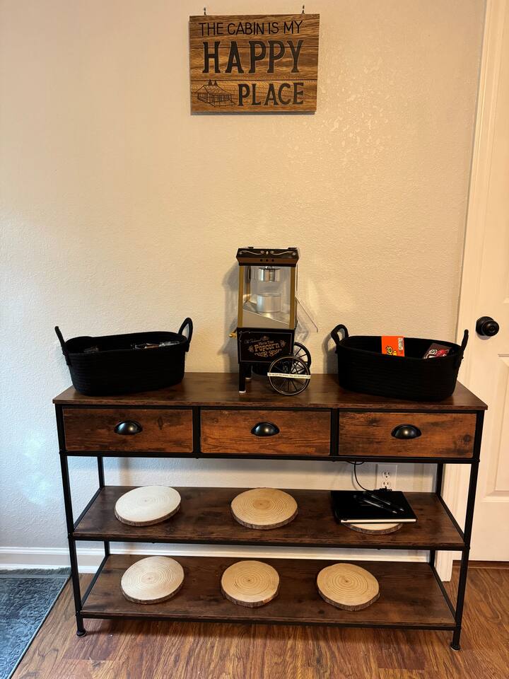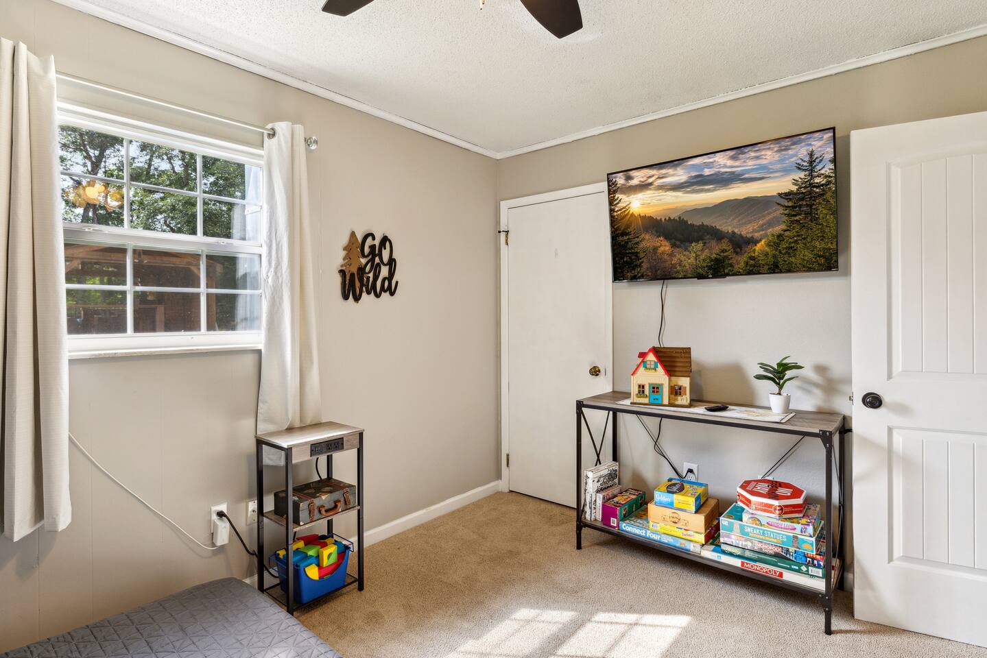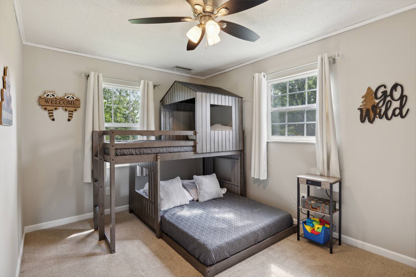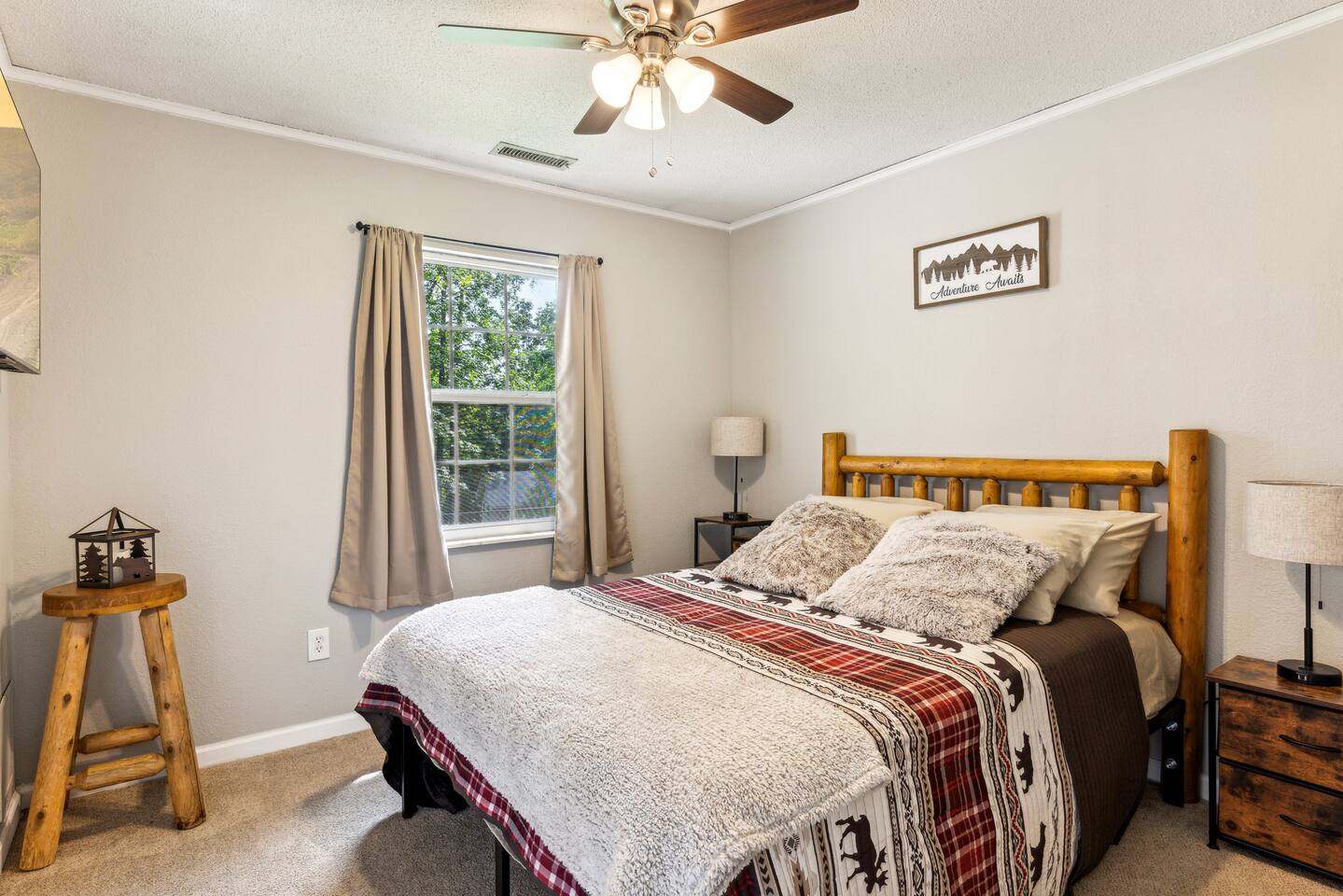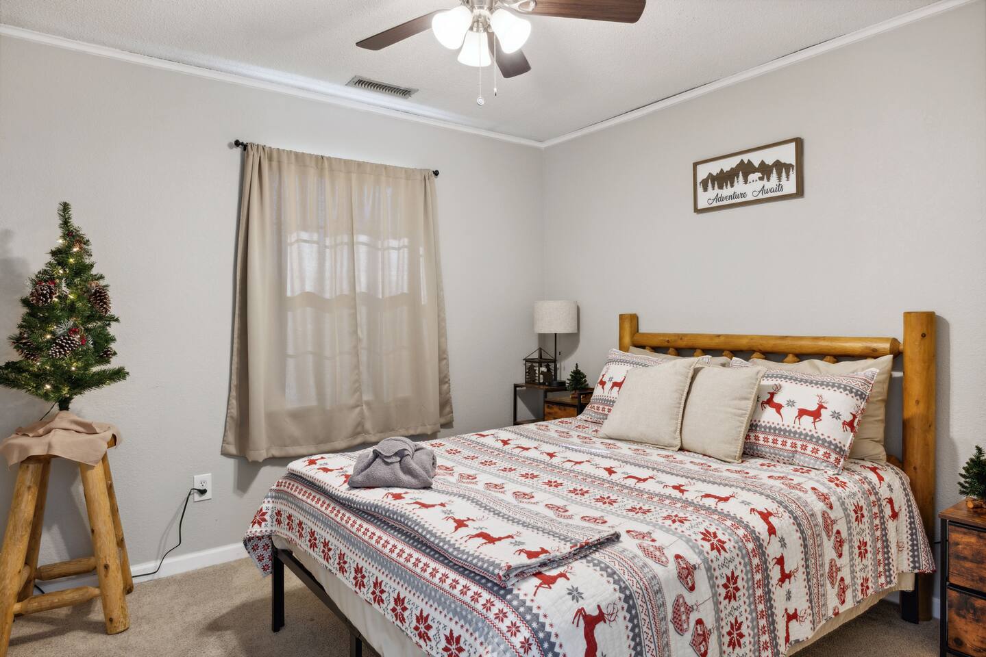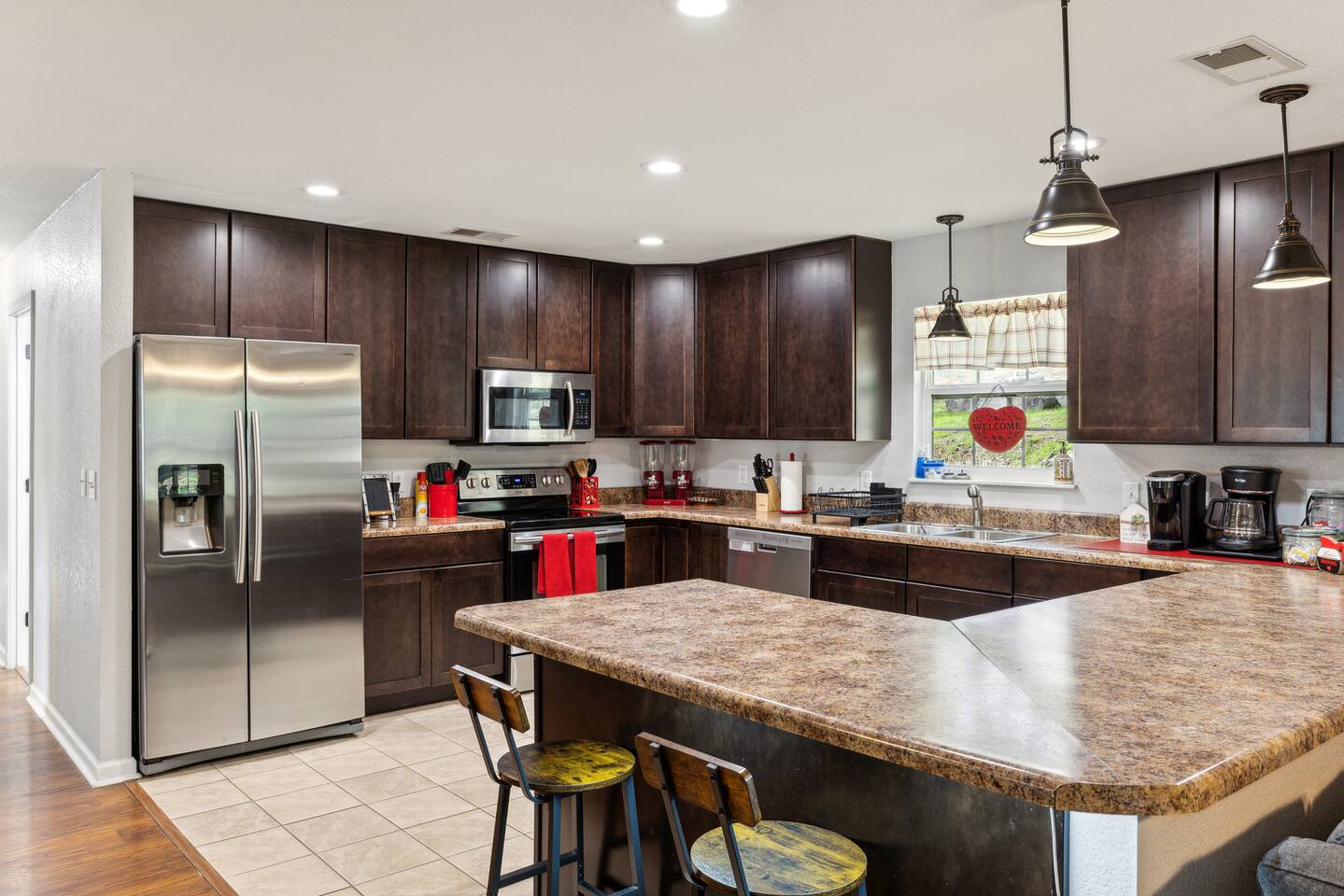 Smoky Mountain Cozy Cottage - Family-Friendly Cabin with Game Room, Tiki Bar, Pool, Hot Tub About this space • Bedrooms: King, Queen, Twin-over-Full Bunk, Sleeper Sofa • Amenities: Scenic Views, Tiki Bar, 7 Smart TVs, Gas Fireplace, Game Room • Location: 2.7 miles to Dollywood, 4 miles to Pigeon Forge Parkway, 12 miles to Great Smoky National Park • Internet: Xfinity High-Speed Wi-Fi Welcome to Smoky Mountain Cozy Cottage, a charming, single-level cabin tucked away in a quiet cul-de-sac just minutes from Dollywood. With easy, no-step access and spacious entryways, our home is designed with accessibility in mind. Situated on a full acre of land surrounded by trees, the cabin offers a tranquil escape while still being close enough to hear the Dollywood Express and catch glimpses of fireworks from the Tiki Bar. The Space • Our cozy cabin sleeps up to 8 guests and features: • Master Bedroom: King bed with en suite, 55” Smart TV • Bedroom 2: Queen bed, 55” Smart TV • Bedroom 3: Twin-over-Full Bunk Bed, board games, 55” Smart TV • Living Room: Sleeper sofa with sheets and blankets for extra guests o Equipped with 65” Smart TV, Popcorn Maker and more • Bathrooms: Full stocked with towels, soap, shampoo, conditioner, body wash, and other essentials • Spacious kitchen equipped with new appliances, including an air fryer, crockpot, two coffee makers, and more • Dining room with fireplace, dining table set for 8 plus additional seating at the counter • High chair attachment and kids’ dishes available • Complimentary coffee, sugar, and creamers provided Entertainment • 7 Smart TVs, including outdoor TVs at the Tiki Bar • Game Room with arcade games (Pac-Man, Galaga, Dig Dug), foosball table, and HDMI hookup for your own console • Board games, cards, checkers, and chess for family fun • Outdoor Living • Relax by the gas fireplace • Tiki Bar: 55” Smart TV, seating for 8, fridge/freezer • Pool: Heated pool (open March - October), seating for 12, pool lights • Hot Tub with seating for 7 open year round • Gas Grill: Includes rotisserie and griddle insert Guest Access • Check-In: Contactless via electronic keypad • Enjoy full access to the cabin, including the Tiki Bar, game room, pool, and backyard areas Additional Information • Roads & Access: Flat driveway and easy-to-navigate roads • Internet & Cell Service: High-speed Xfinity Wi-Fi provided • No Smoking/Vaping: Smoking permitted at the Tiki Bar or designated outdoor areas • Pets: Up to 2 dogs are allowed, with pet fee. We ask that the dogs be crated when unattended and left alone at the home. • Age Requirement: Guests must be 21+ (except for children with their parents) Whether you’re here for adventure, relaxation, or quality family time, Smoky Mountain Cozy Cottage offers the perfect setting for your next getaway. We look forward to hosting you!